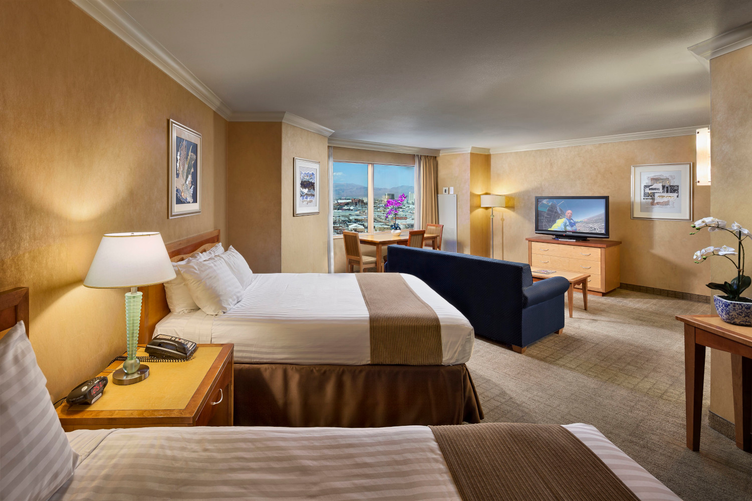 The Classic Family Suite is 610 square feet and includes two queen beds. It is the perfect space for traveling families. Features a designated and spacious living area and oversized bathroom with a Roman tub and shower.